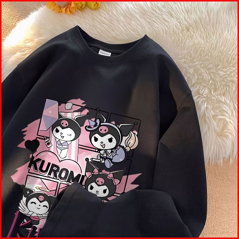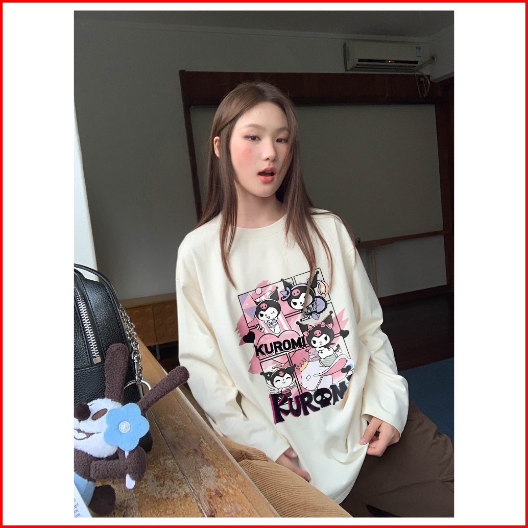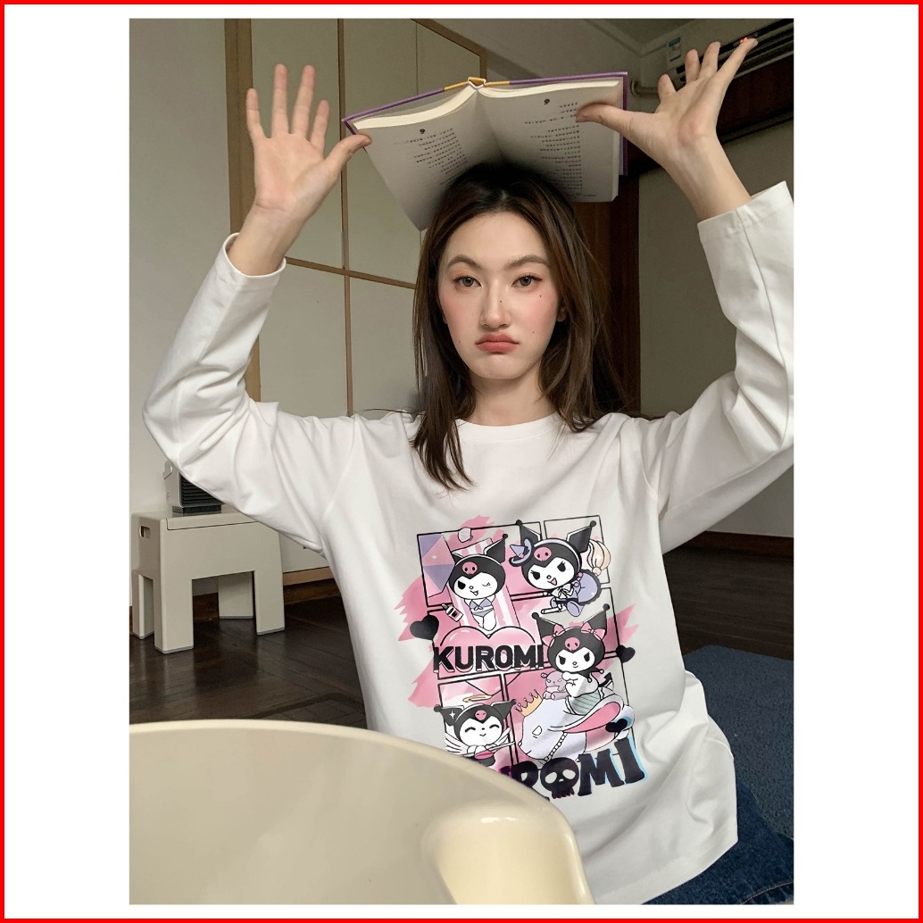 Forteid Atasan Kaos Wanita Oversize Lengan Panjang Korean Style Cetakan Pola Kuromi Lucu Sanrio Baju Kaos Polos Cotton C