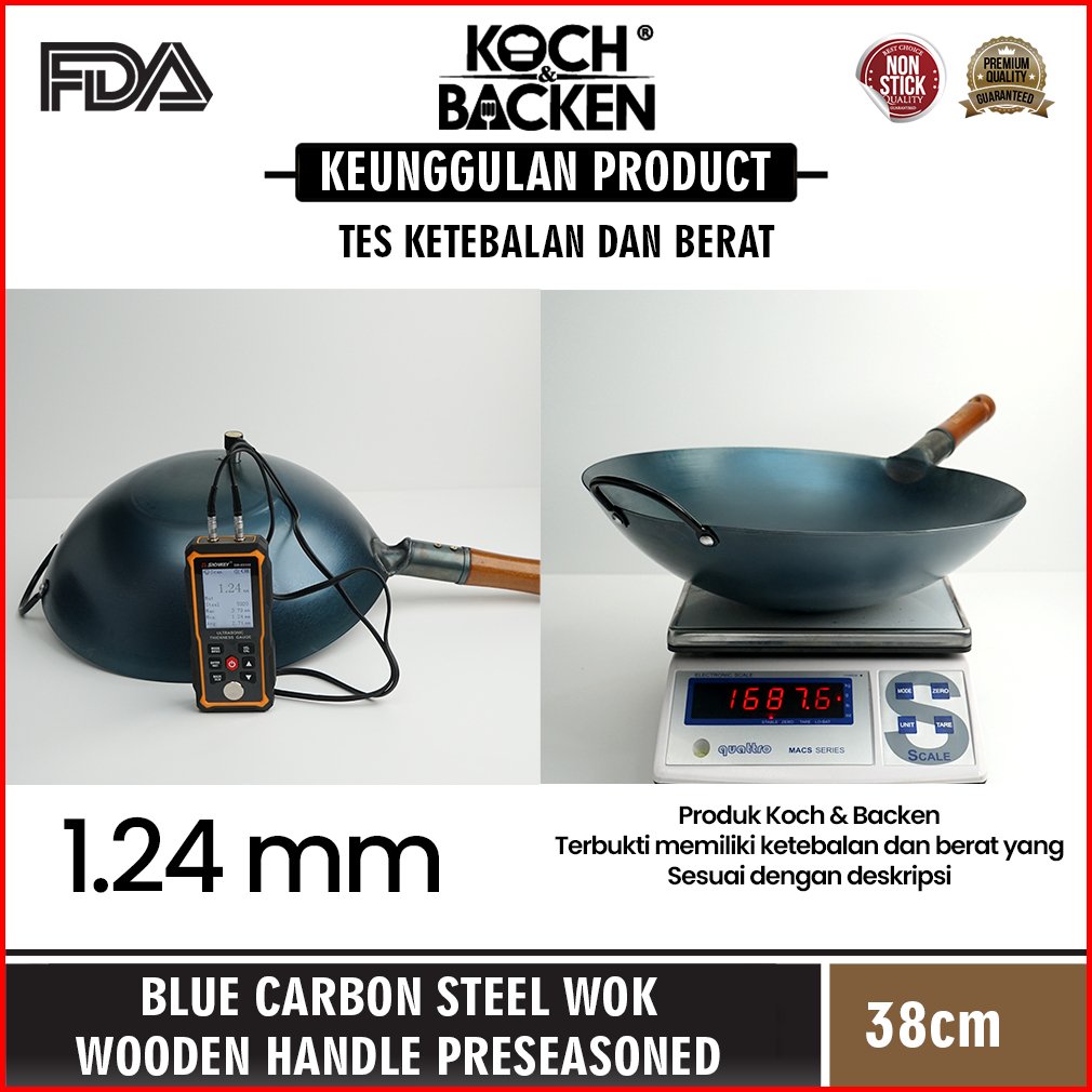 Koch Backen Blue Carbon Steel Wok Wooden Handle Preseasoned 38cm - Wajan Kuali Penggorengan Baja Gagang Kayu Anti Lengke