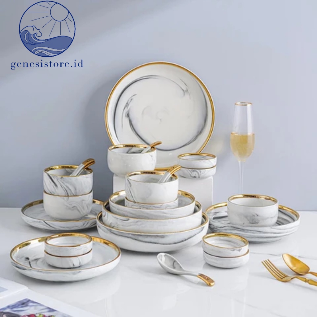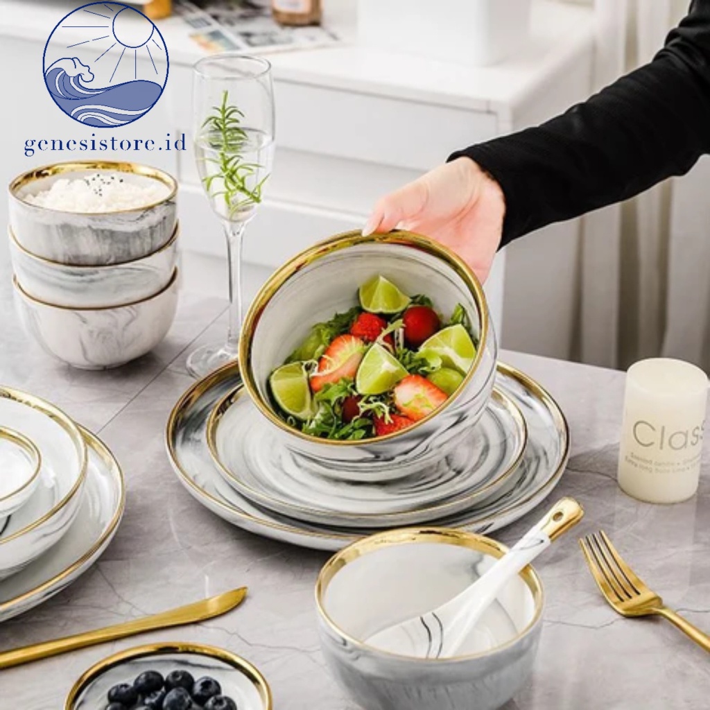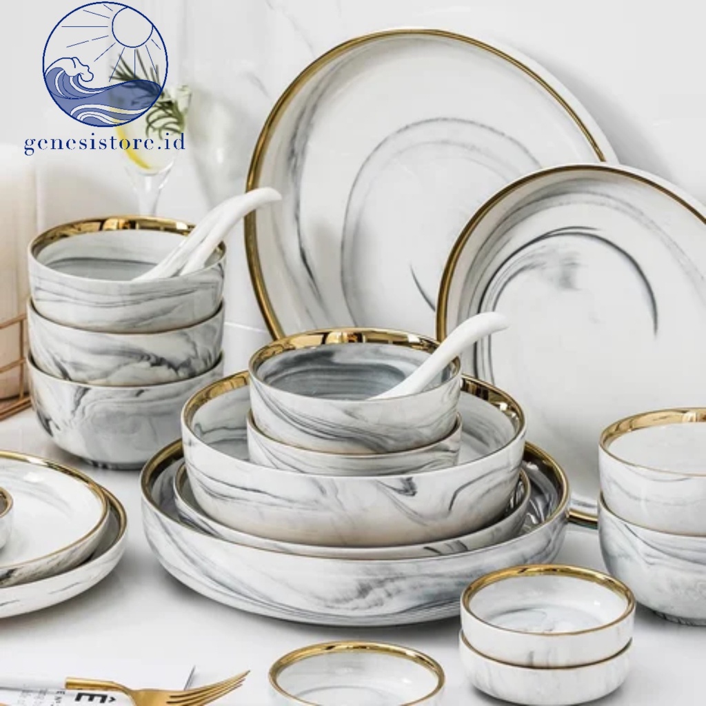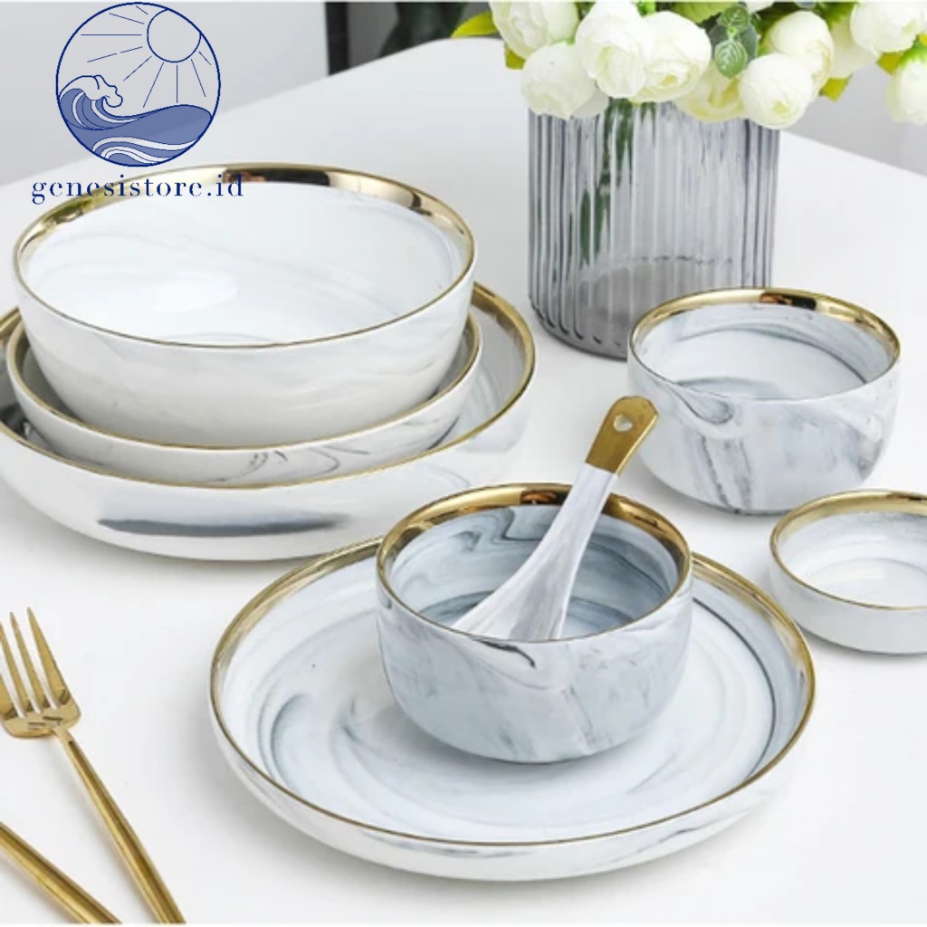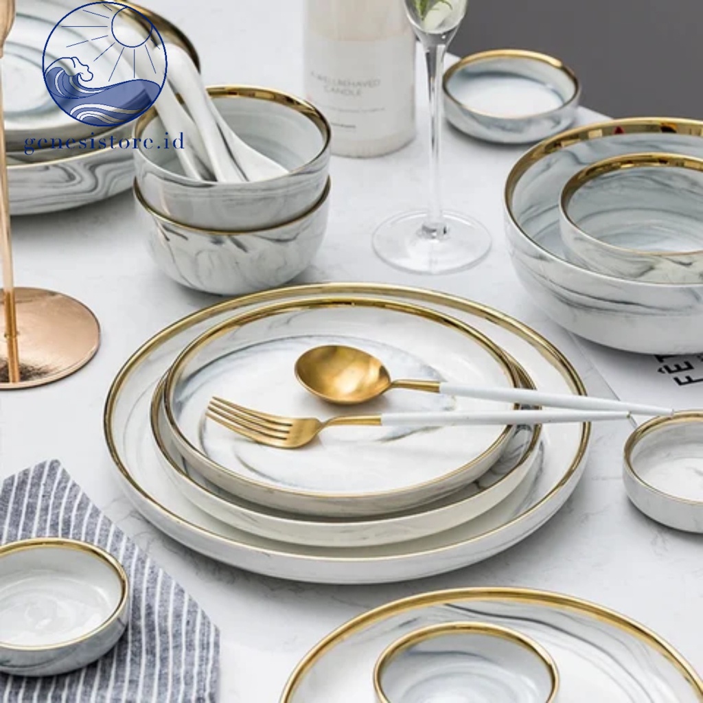 DEKORCUY GENESISTOREID PIRING MAKAN KERAMIK MARBLE ABU ABU LIST G0.LD piring rim G0.LD mangkok cangkir piring estetik piring makan elegan sultan