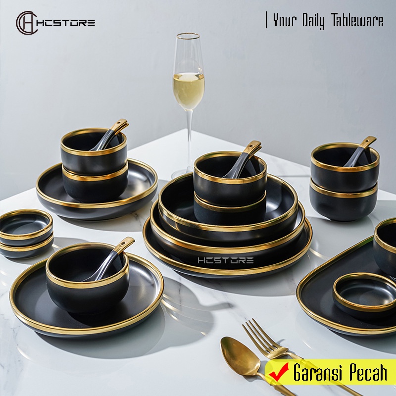 Piring Dan Mangkuk Keramik Sultan Warna Hitam G0.LD Mewah Microwave Safe