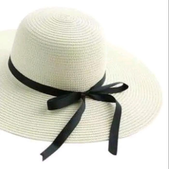 Topi pantai lebar pita kecil/Topi pantai bahan straw/topi pantai Import/Topi pantai terlaris Wanita - PUTIH
