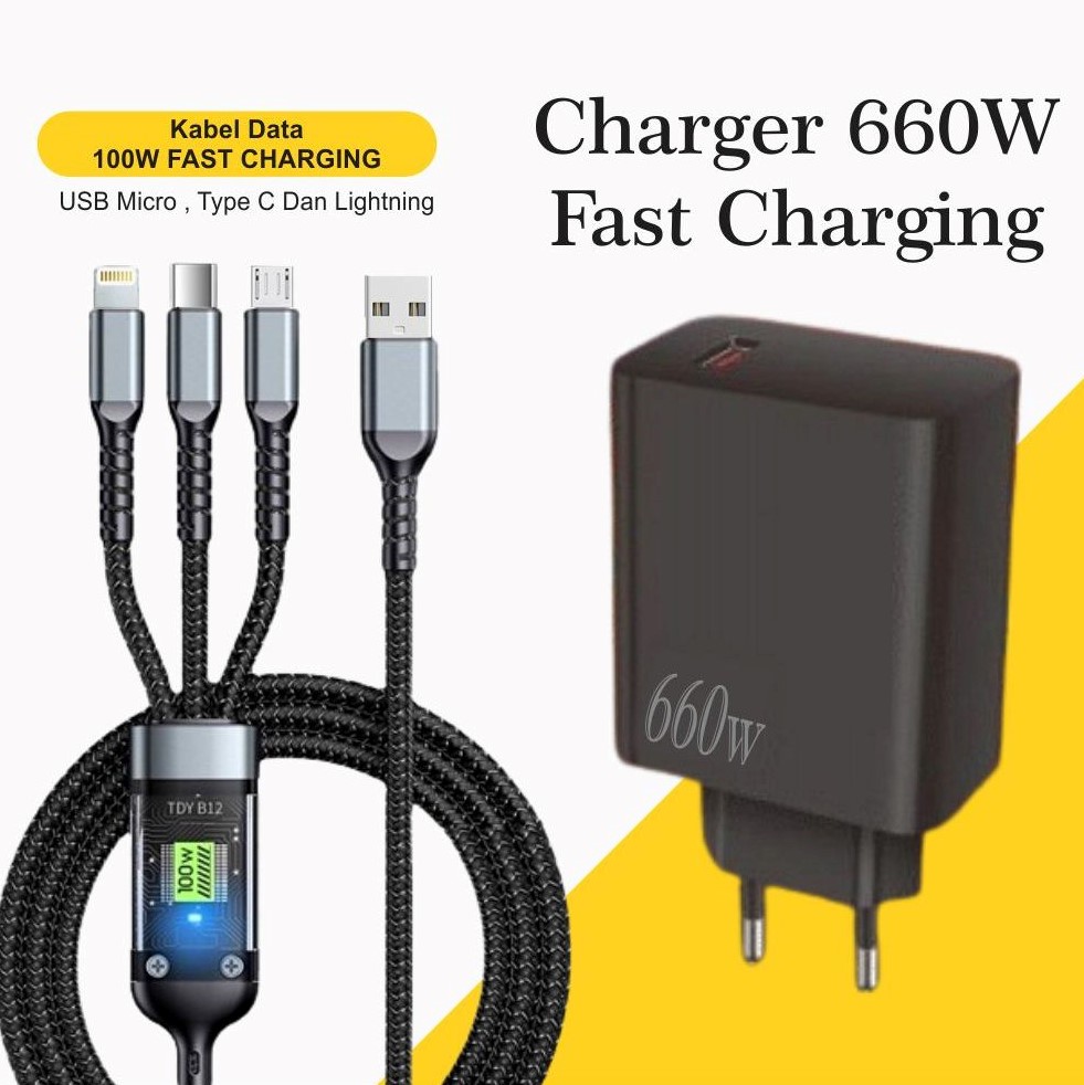 Charger 660W NEO 5G dengan Kabel Data 3 in 1 Fast Charging 100W USB Micro Type C Lightning Best Quality