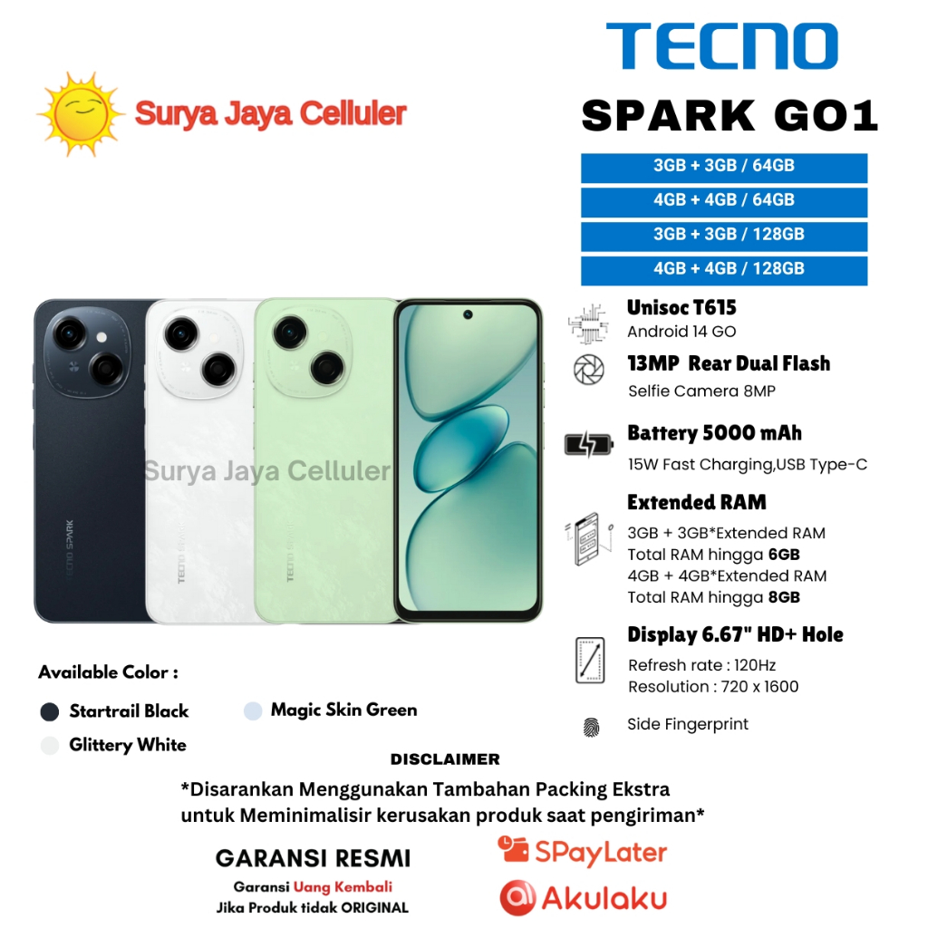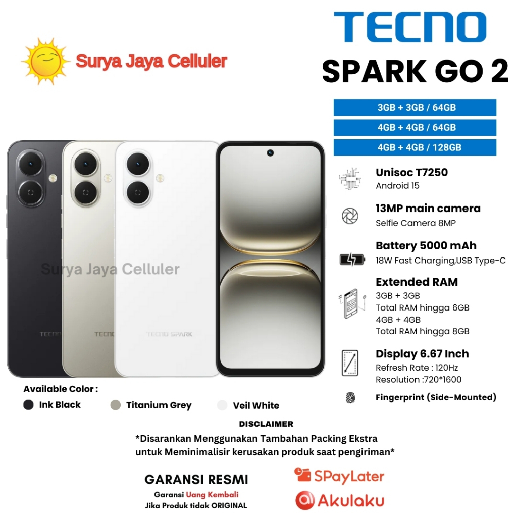 TECNO SPARK GO 2 4/128GB, GO 2 4/64GB, GO 2 3/64GB, GO 1 4/64 GB(Garansi Resmi Tecno 1 Tahun)