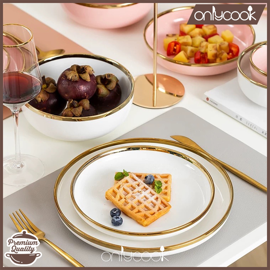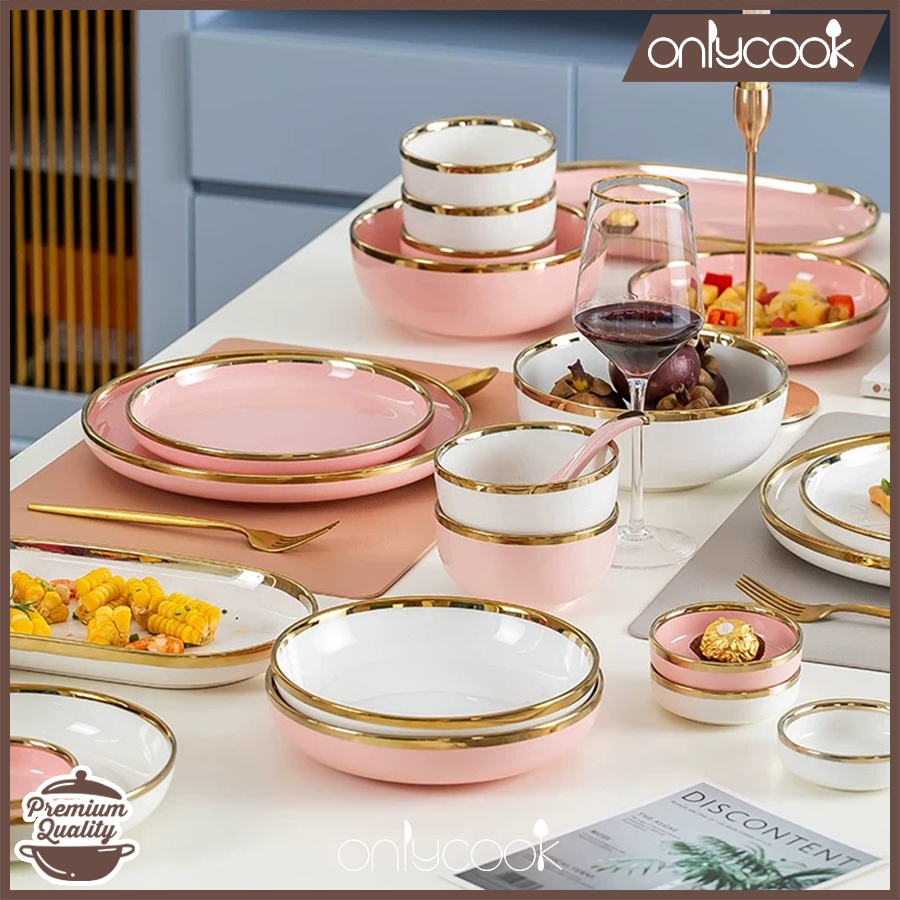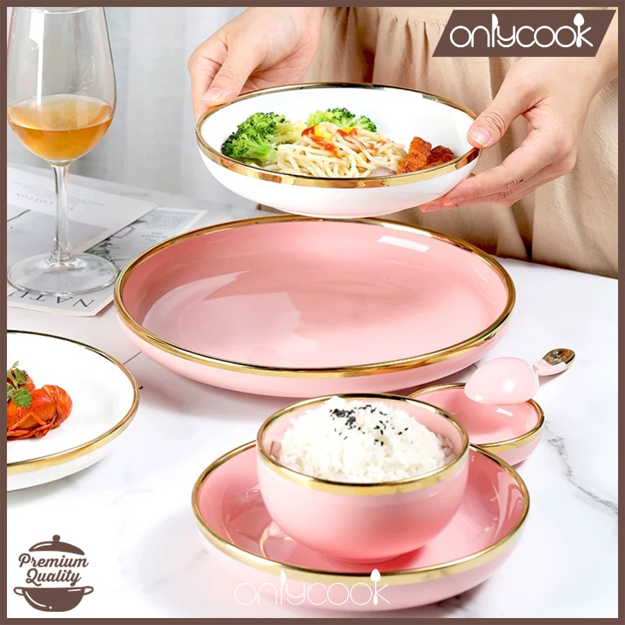 ONLYCOOK Piring Makan Keramik Pink List G0.LD / Piring Merah Muda Keramik List G0.LD / Mangkuk Keramik Pink G0.LD Mewah Elegan