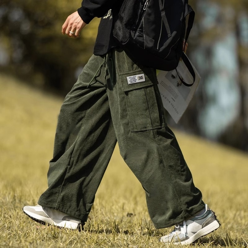 KeyBoy celana cargo pria panjang baggy corduroy straight causal stretch pants celana pinggang karet korean style