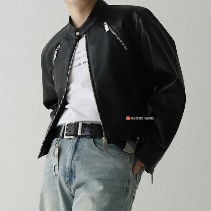 Jaket Crop Boxy Pria Granger Mafia Semi Kulit Sintetis Viena PU Leather Jacket Vintage Midnight Collar Classic Top Style Bikers