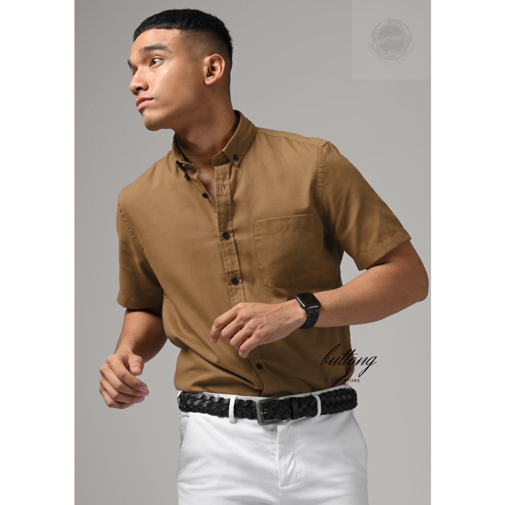 kemeja polos pria lengan pendek cowok casual kantoran laki laki coklat mocca cream