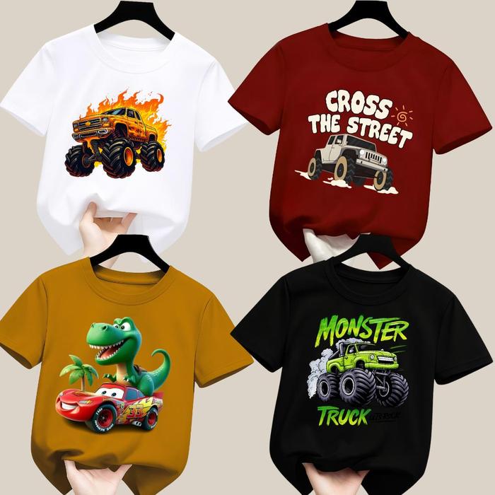 PAKET HEMAT ISI 4PCS Kaos Anak Mobil Monster Truck Usia 2-16 Tahun Promo Unisex - KA Putih Maroon Hitam Mustard S