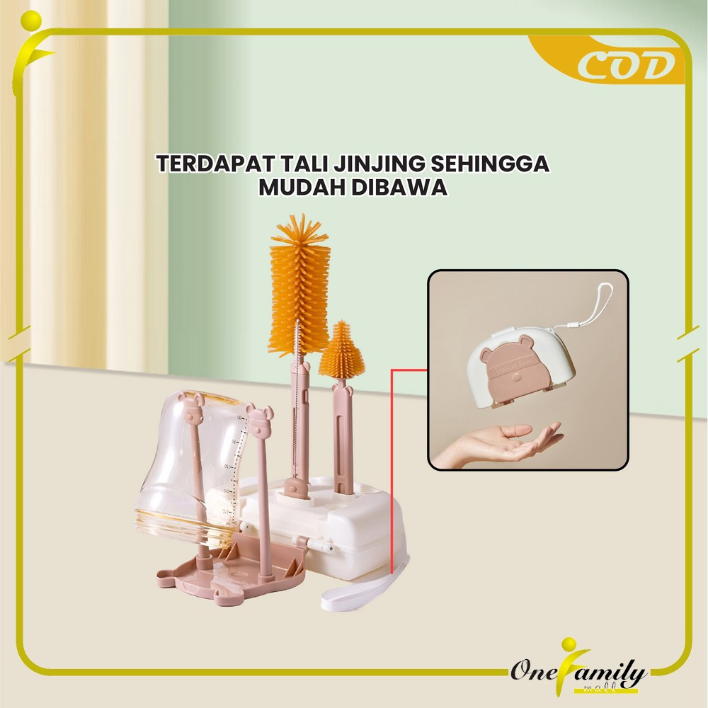 ONE-C1069 Sikat Botol Susu Bayi 6IN1 dengan Rak Pengering Botol Portable / Set Bottle Brush Set + Drying Rack Bear Trave