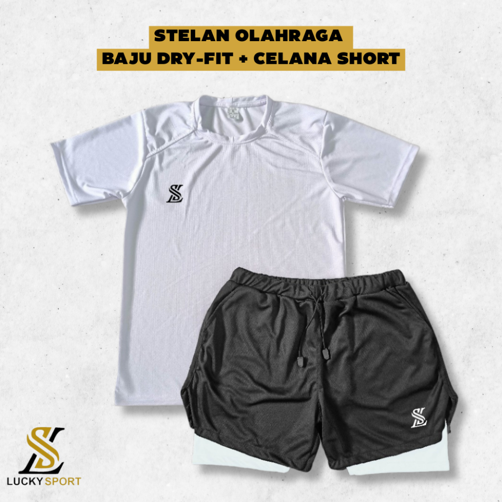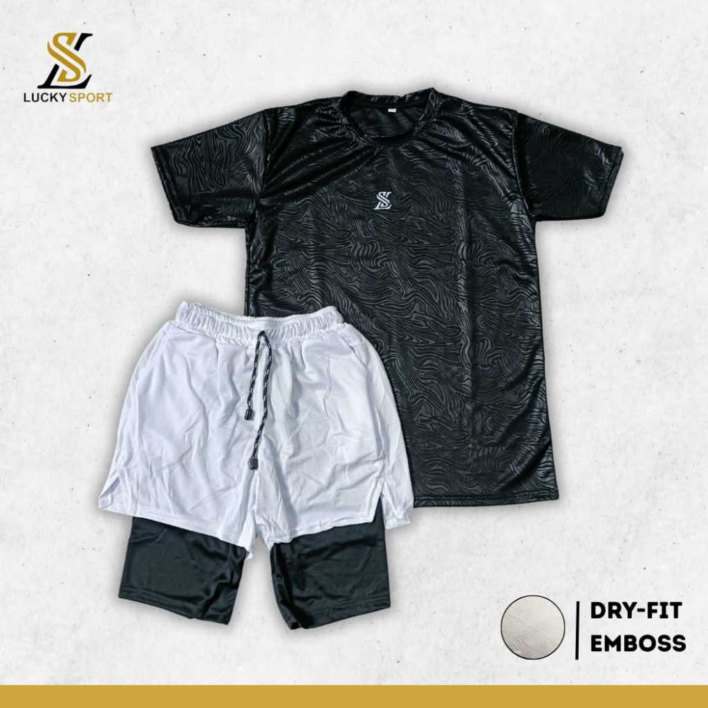 Setelan Olahraga Pria Double Layer 1 Set Baju Kaos Dryfit Celana Pakaian Outdoor Running gym lari Badminton Volly Futsal