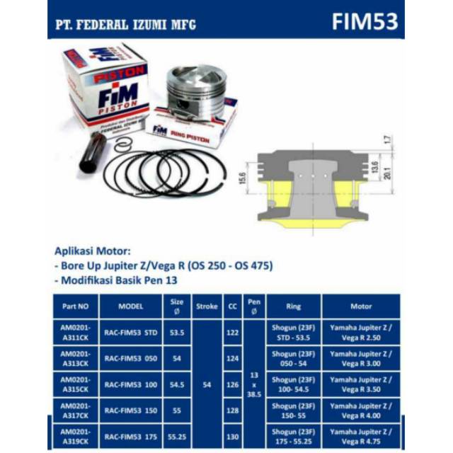PROMO Piston kit FIM Bore Up 130 Jupiter Z Burhan - Vega R New XB Pin 13 DM 53.5, 54, 54.5, 55, 55.25 mm