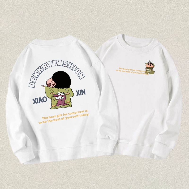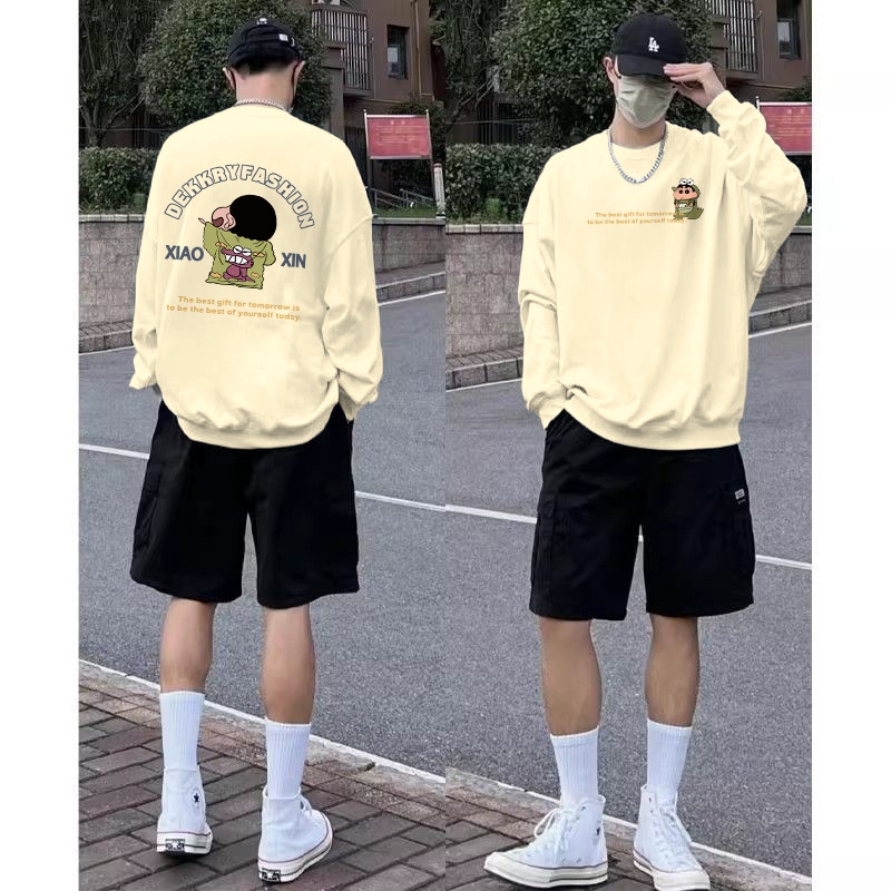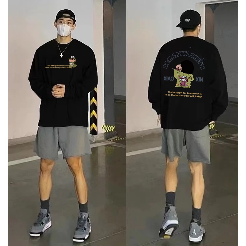 RENELLE Sweater T Shirt Pria Crayon Shin chan Dinosaurus Merah Muda Oversize Casual Baju Cowok Keren Lengan Panjang Crew