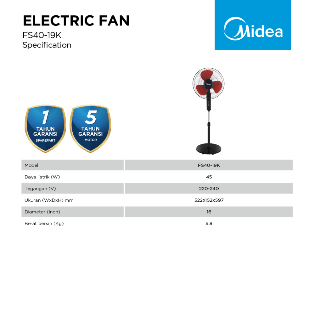 Midea Kipas Angin FS40-19K Standing Fan 16 Inch