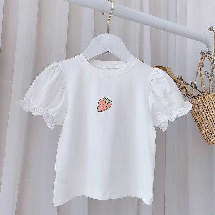 Baju Kaos T-Shirt Fashion Anak Perempuan Lengan Pendek Motif Strawberry Warna Putih Dan Pink - Puith 100