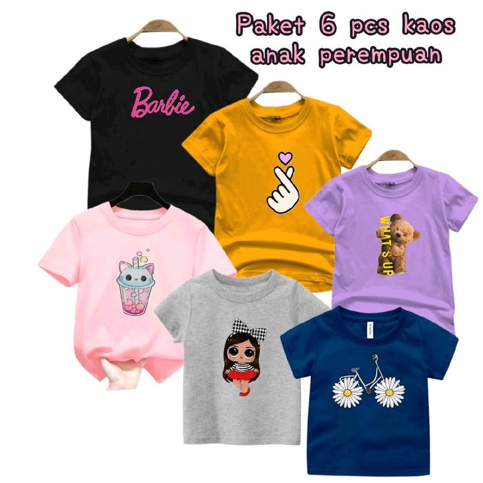 Paket 6 Pcs Kaos Anak Perempuan Gambar Campur Lucu Katun Baju Fashion - 6pcs campur S