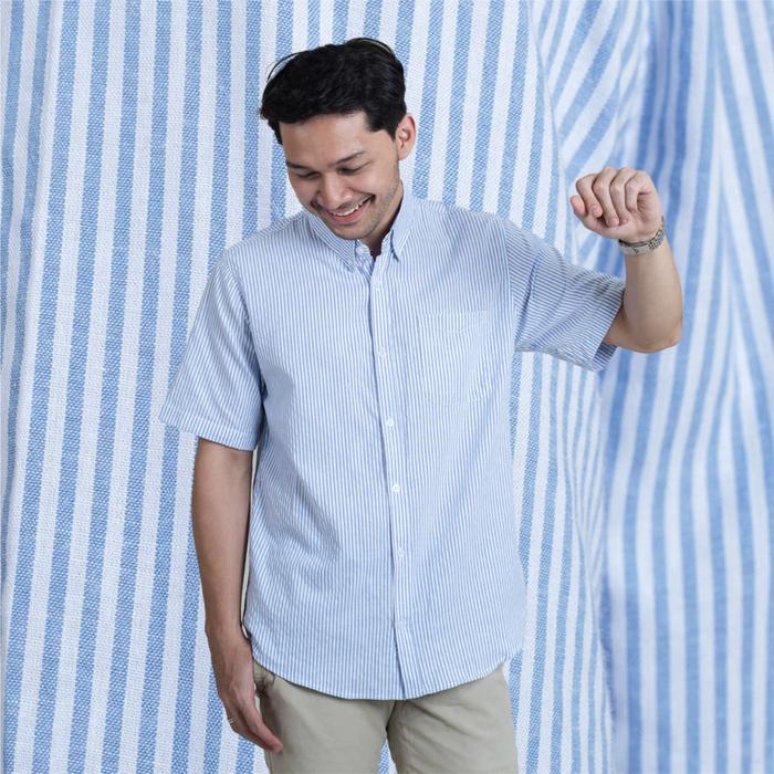 Kemeja Garis Pria WOODCUTTER Basic Breton Stripes - Light Blue Pendek - Light Blue S