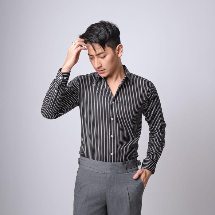 VENGOZ Kemeja Pria Slim Fit - Hugo Stripe Shirt Black LS - Black M