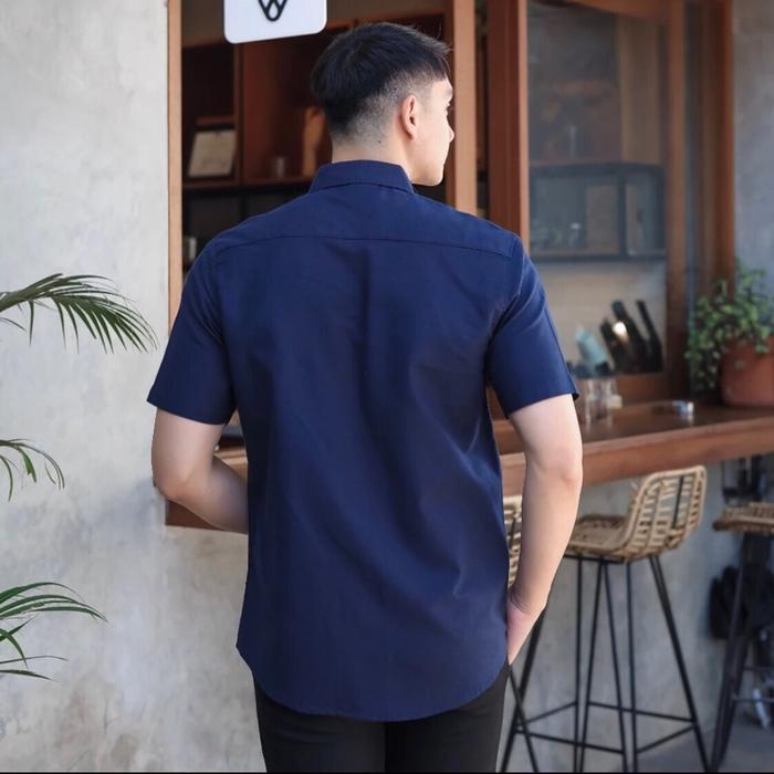 Kemeja Pria Polos Navy Biru Dongker Lengan Pendek Casual Katun ALJOSA - Hitam M