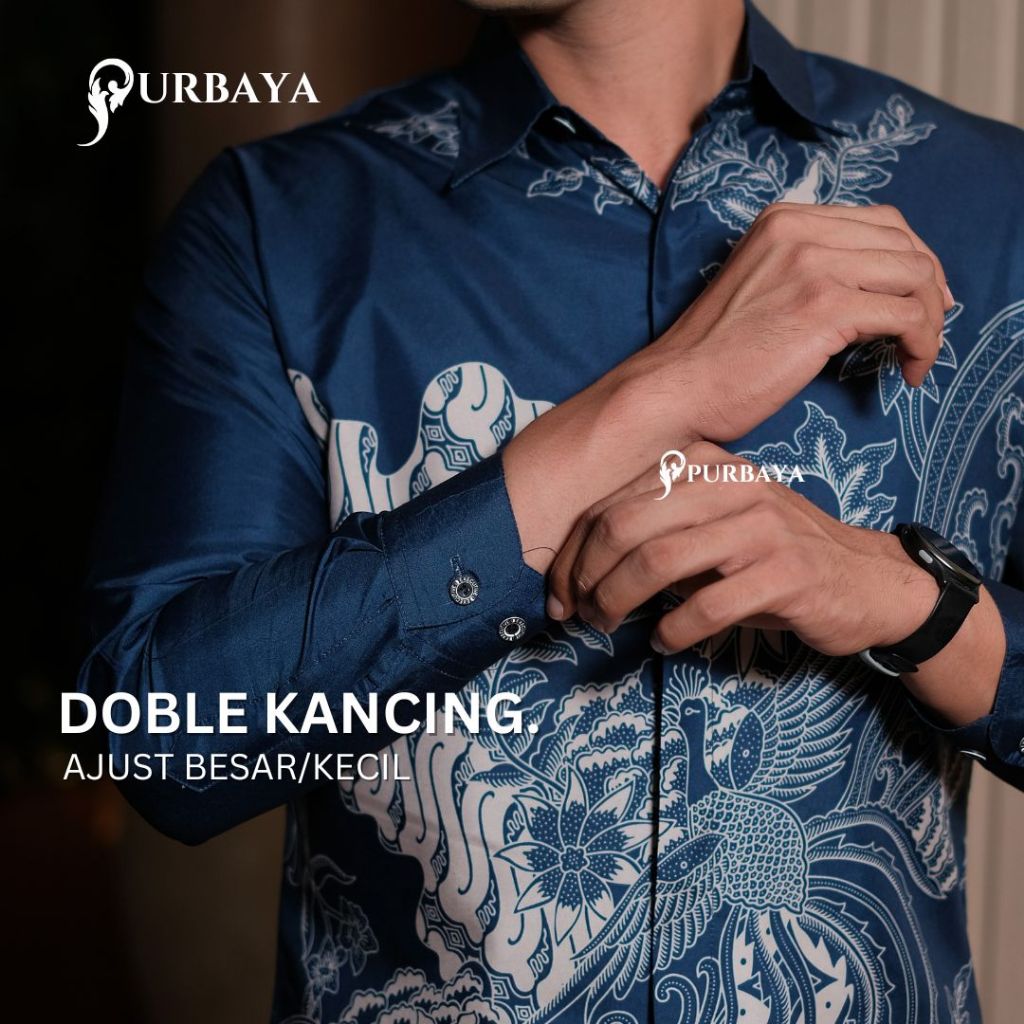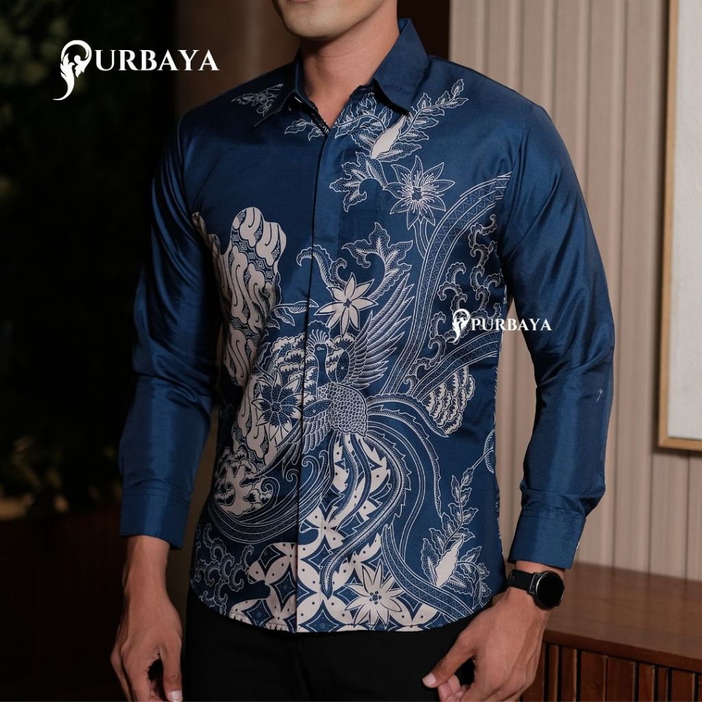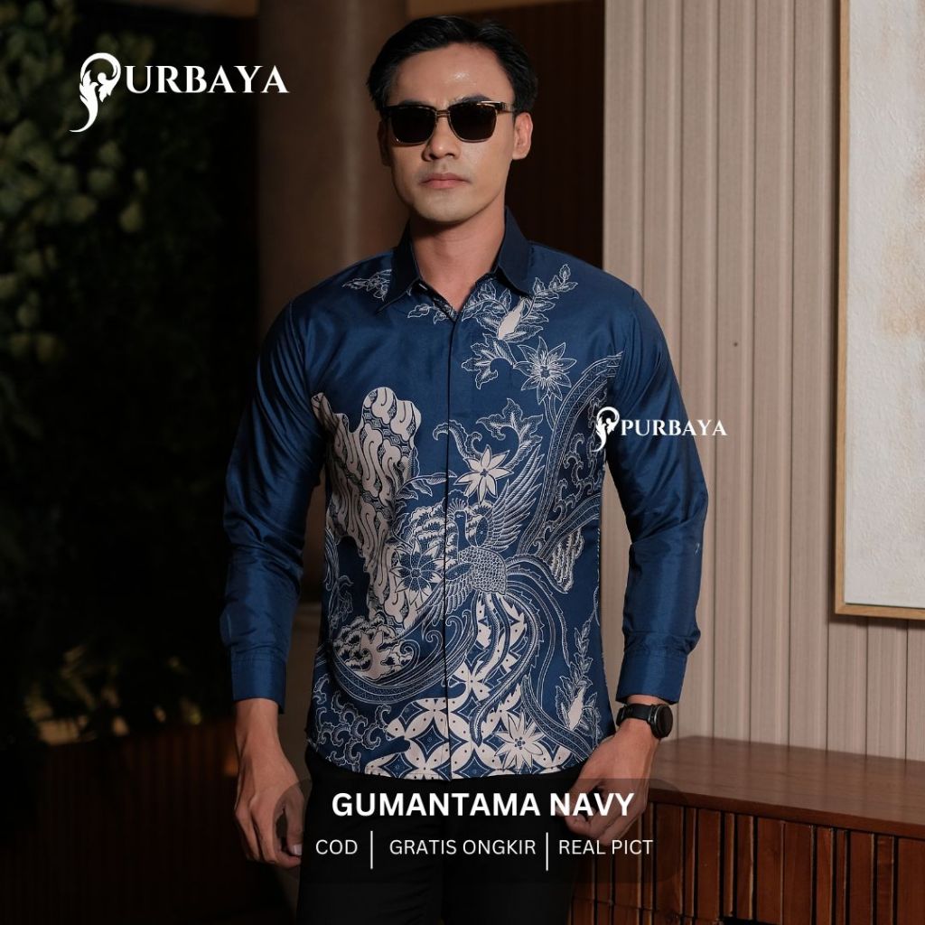 PURBAYA BATIK Motif Gumantama Navy Kemeja Batik Pria Slimfit Katun Premium Lapis Furing Lengan Panjang