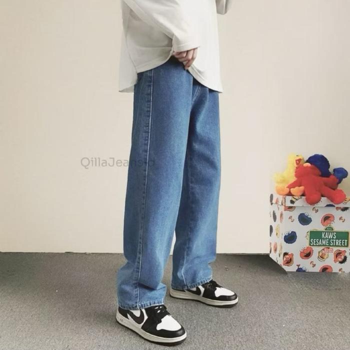 Youjins - Celana Baggy Jeans Pria Celana Loose Jeans Panjang Denim Korean Style Cowok Hitam Slim Fit