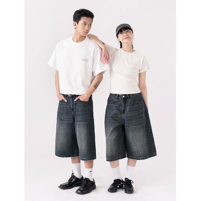 UOUO Celana Denim Vintage Washed 3/4 Jeans Pinggang Tinggi Unisex Biru & Hitam Pendek Panjang Gaya