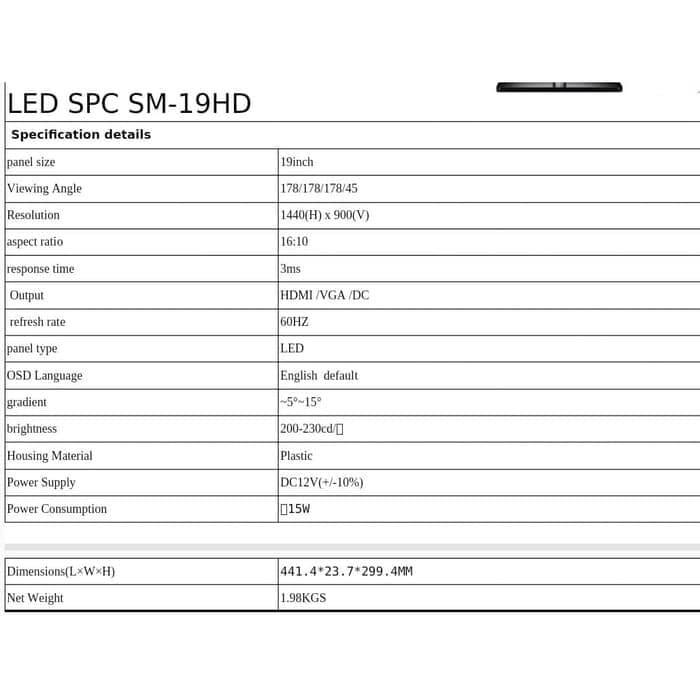 SPC SM-19HD 19 INCH MONITOR - HDMI VGA 1440X900P