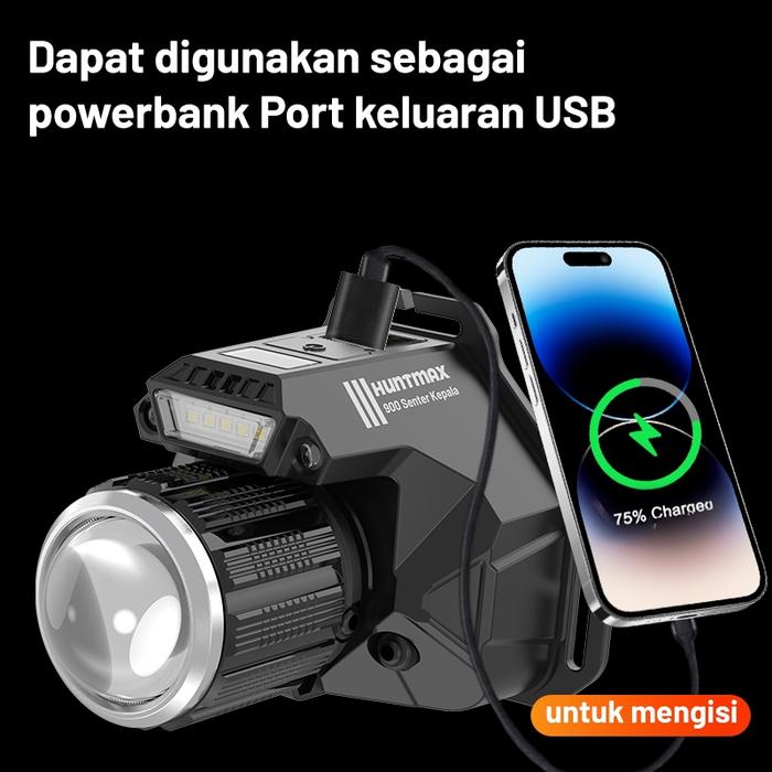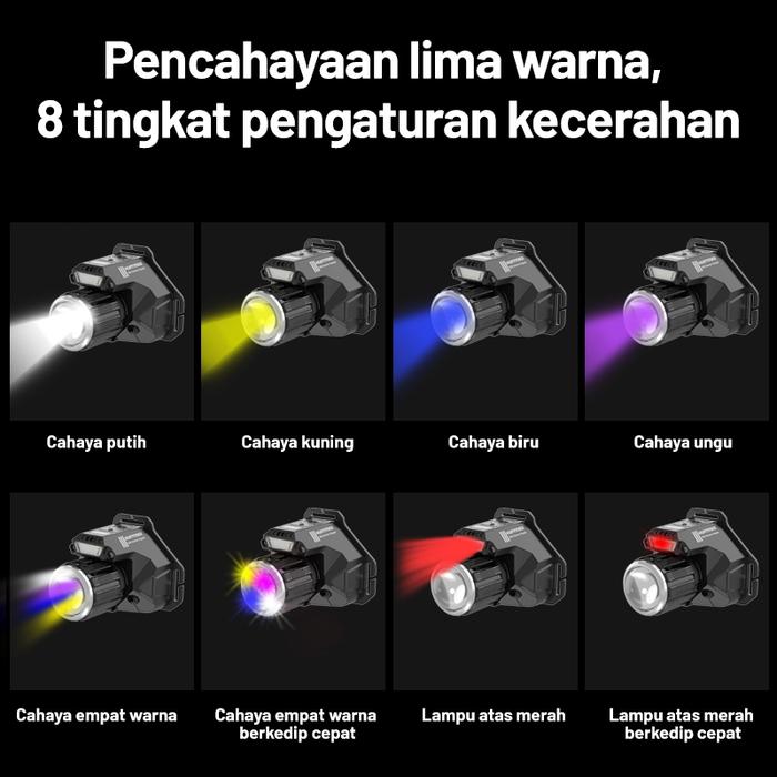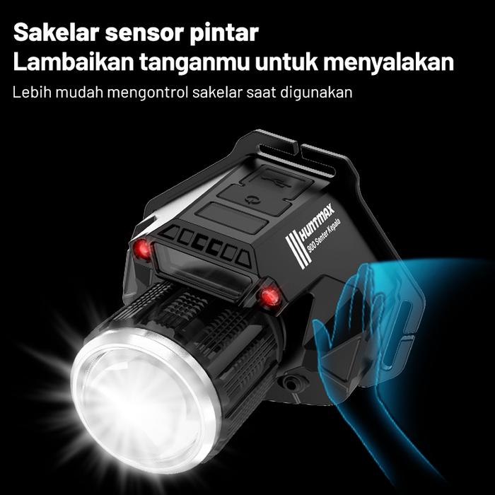 HUNTMAX HM-900 SENTER KEPALA CAHAYA LAMPU DEPAN LIMA WARNA FOKUS PUTAR TAMPILAN BATERAI DIGITAL 80W