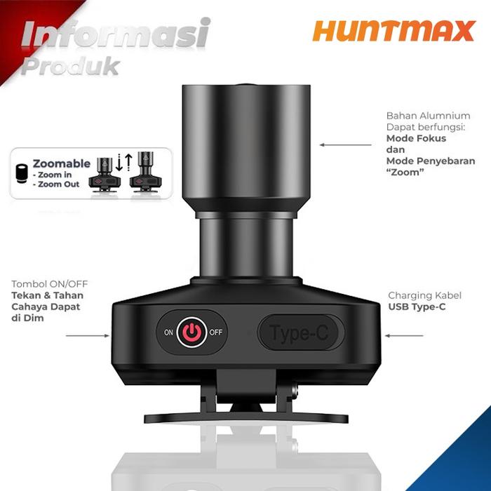 HUNTMAX SENTER KEPALA CAHAYA / LAMPU SENTER KEPALA MODE CAHAYA FOKUS & CAHAYA MERATA ZOOM 60W/800LUMEN