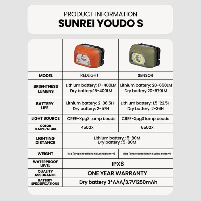 SUNREI SENTER KEPALA YOUDO S BATRE HYBRID LITIUM AAA HEADLAMP OUTDOOR 400 600 LUMENS WATERPROOF IPX8 - RED LIGHT, READY