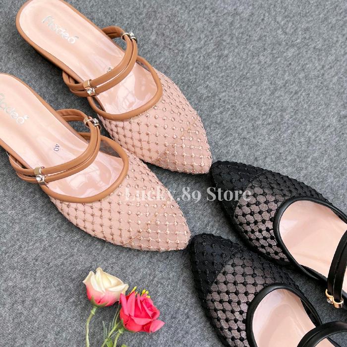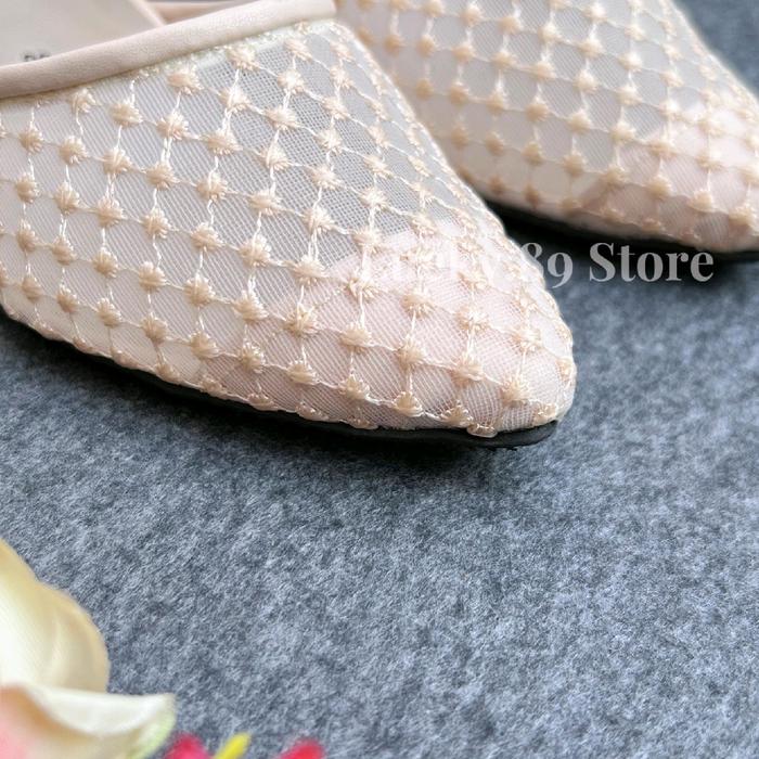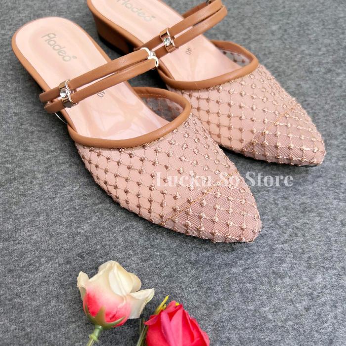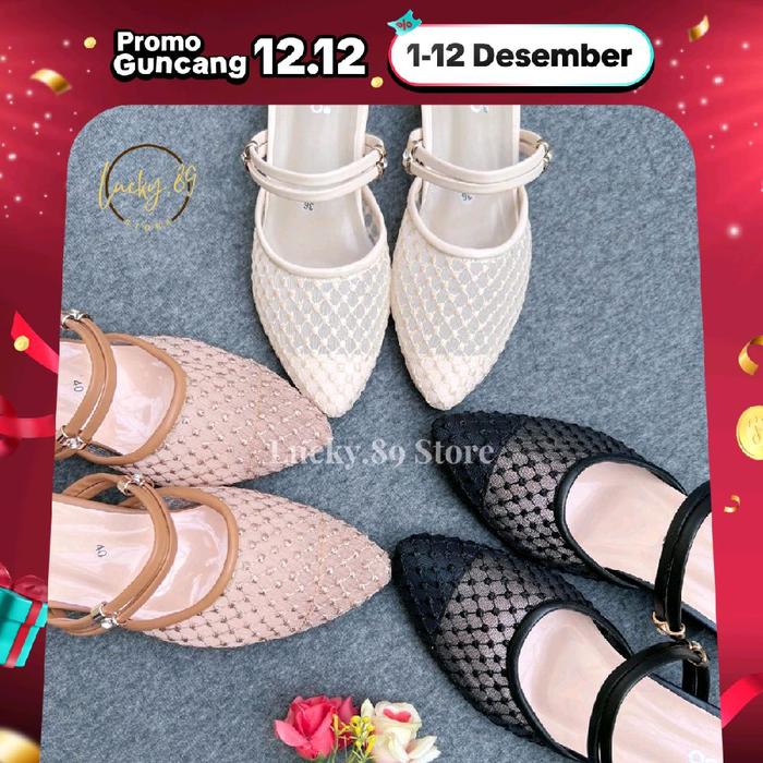Fladeo Sandal Wanita Brukat Heels 3 Cm Sendal Cantik Mewah - Cream, 36