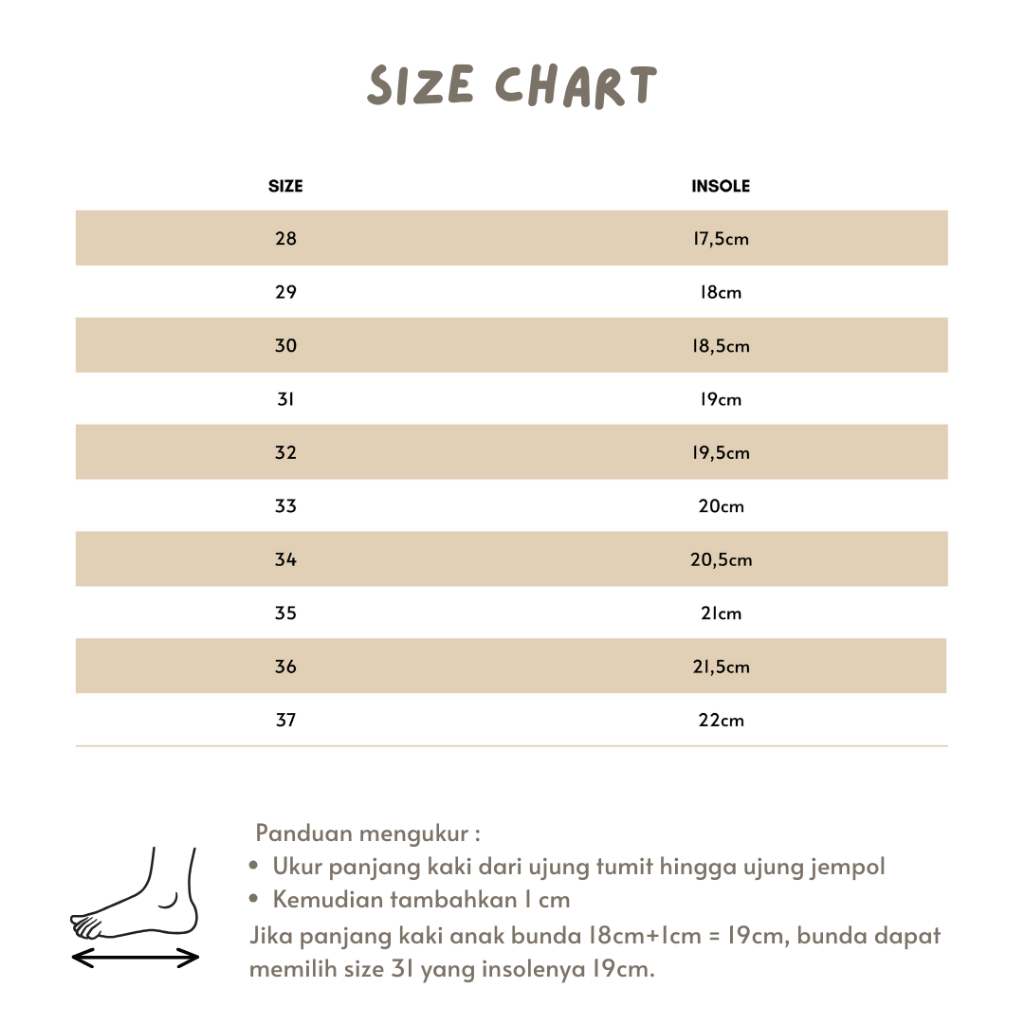 SIZE 28 (17,5cm), SIZE 29 (18cm), SIZE 30 (18,5cm), SIZE 31 (19cm), SIZE 32 (19,5cm), SIZE 33 (20cm), SIZE 34 (20,5cm), SIZE 35 (21cm), SIZE 36 (21,5cm), SIZE 37 (22cm)