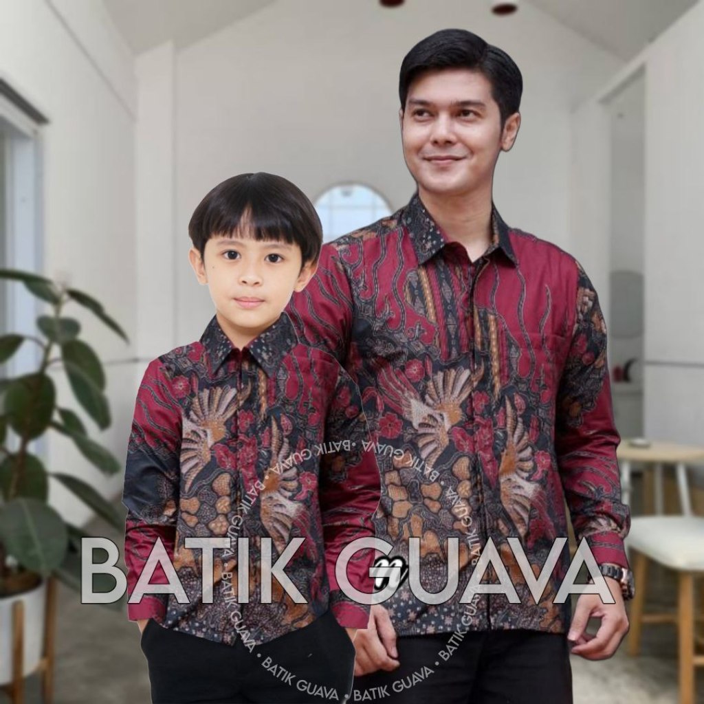 BATIK GUAVA - Kemeja Batik Pria lengan Panjang - Batik couple Ayah dan Anak Laki-laki merah Burgundy
