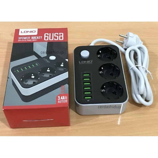 Stop Kontak LDNIO 3 Power Socket 6 USB Charging Anti Static Charger HP 3 Socket Power Strip Cord with 6 USB Ports 1.6m