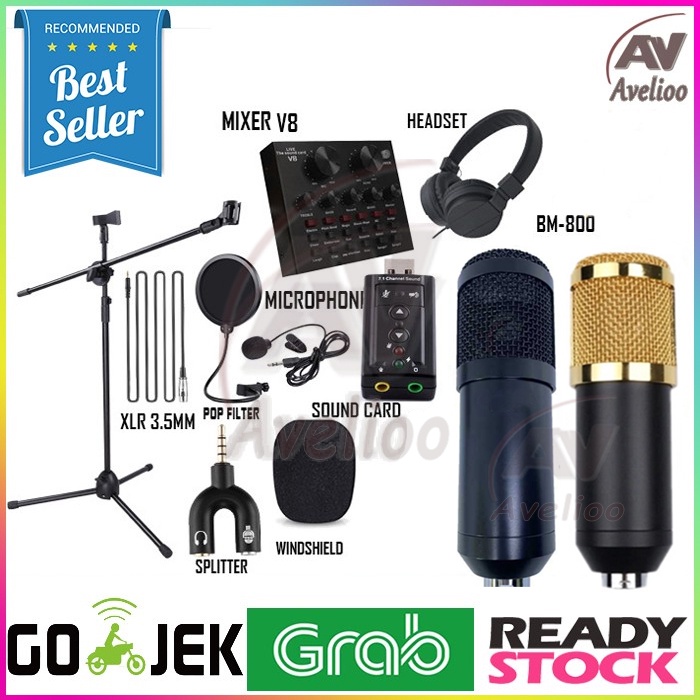 PAKET KUMPLIT MIC CONDENSER BM 800 + STAND LANTAI + SOUNDCARD V8 + SPLITTER - Full Black
