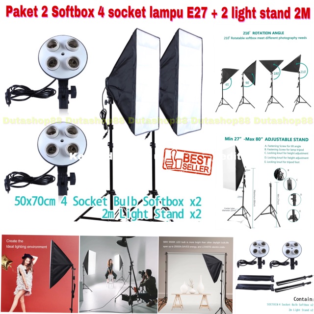 Paket studio 2 set softbox 4 socket lampu E27 + 2pcs light stand 200mm