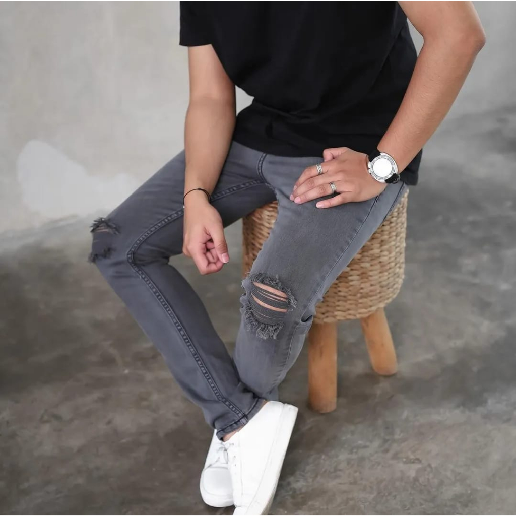 Celana Jeans Ripped Abu Sobek Lutut Pria Model Slim Fit