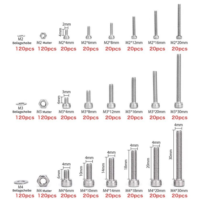Baut Mur Washer Ring Set Bulat Hex M2 M3 M4 Paket 1080 pcs Kunci L Stainless SS 304 Hex Head Socket Screw Nut Washer
