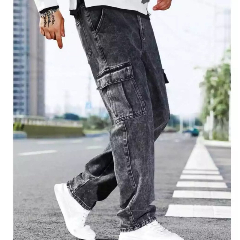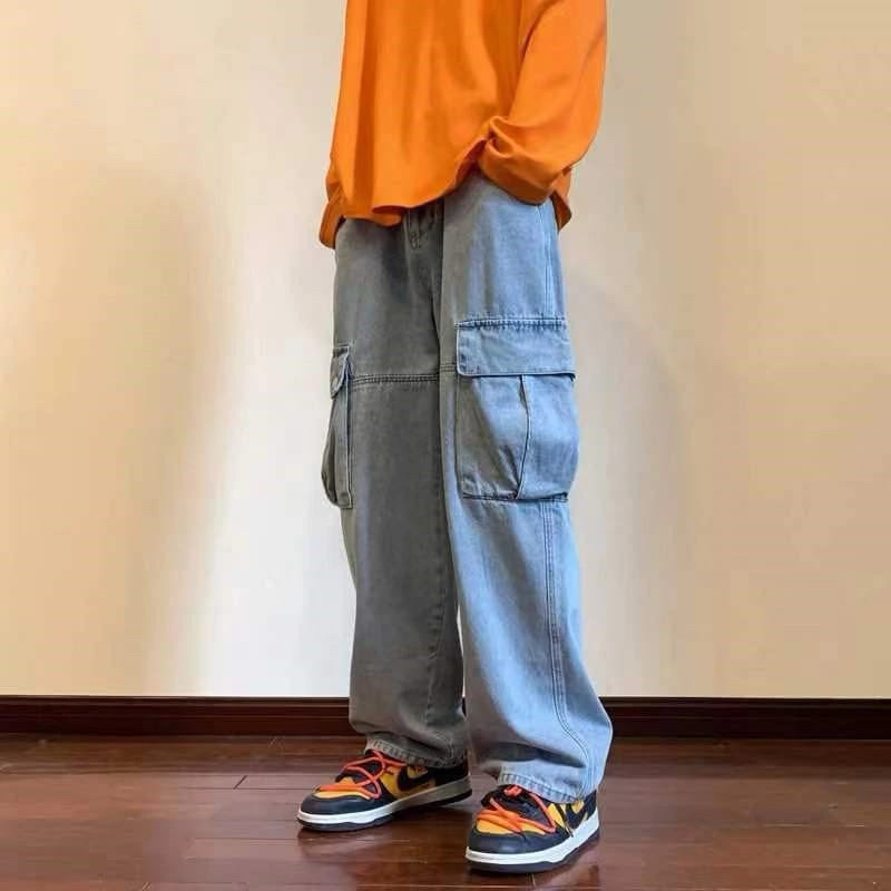 Celana Cargo Panjang Pria Gombrong Korean Style Loose Cargo Pants Blue Jeans Kulot Pants Denim Cowok