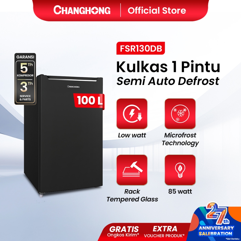 New Changhong Kulkas 1 pintu (Refrigerator) Lemari Es Kapasitas 100 Liter – Black FSR130DB (Semi Auto-Defrost ) (Ajustab
