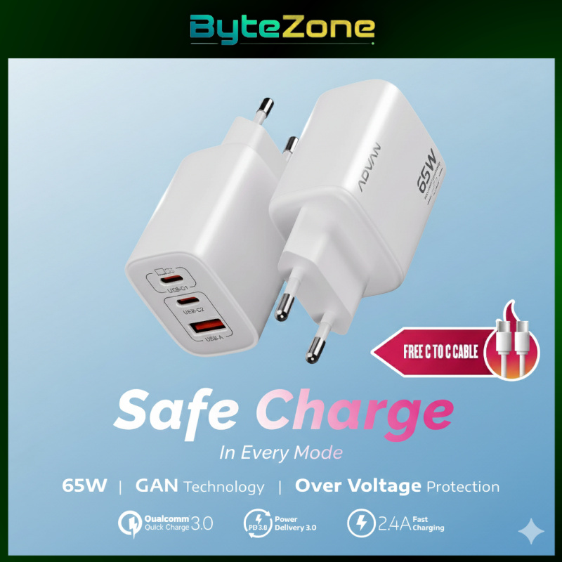 [Mall] ADVAN Safe Charge C65 | Charger GaN 65W PD3.0 QC3.0 Fast Charging untuk Laptop/HP/Tablet + FREE Kabel Type-C✨