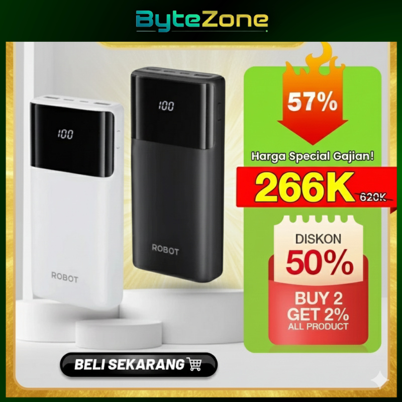 [Mall] ROBOT RT22S Power Bank 20000mAh Real Capacity Fast Charging 15W dengan 3 Output untuk 4 Perangkat + LED✨