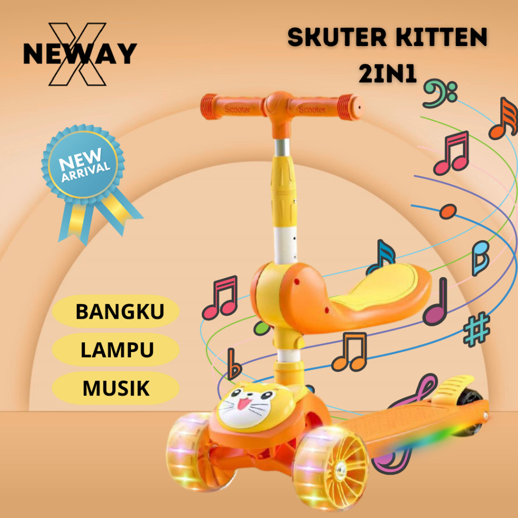 NewayX Skuter Mainan Anak Kucing Lucu 2 in 1 Scooter Lipat 2in1 Duduk Roda Tiga Lampu Musik Rem Toys