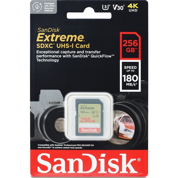 SanDisk SDXC Card Extreme 256GB UHS-I Class 10 U3 V30 for 4K UHD (Up to 180MB/s)