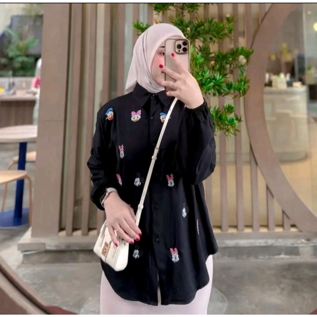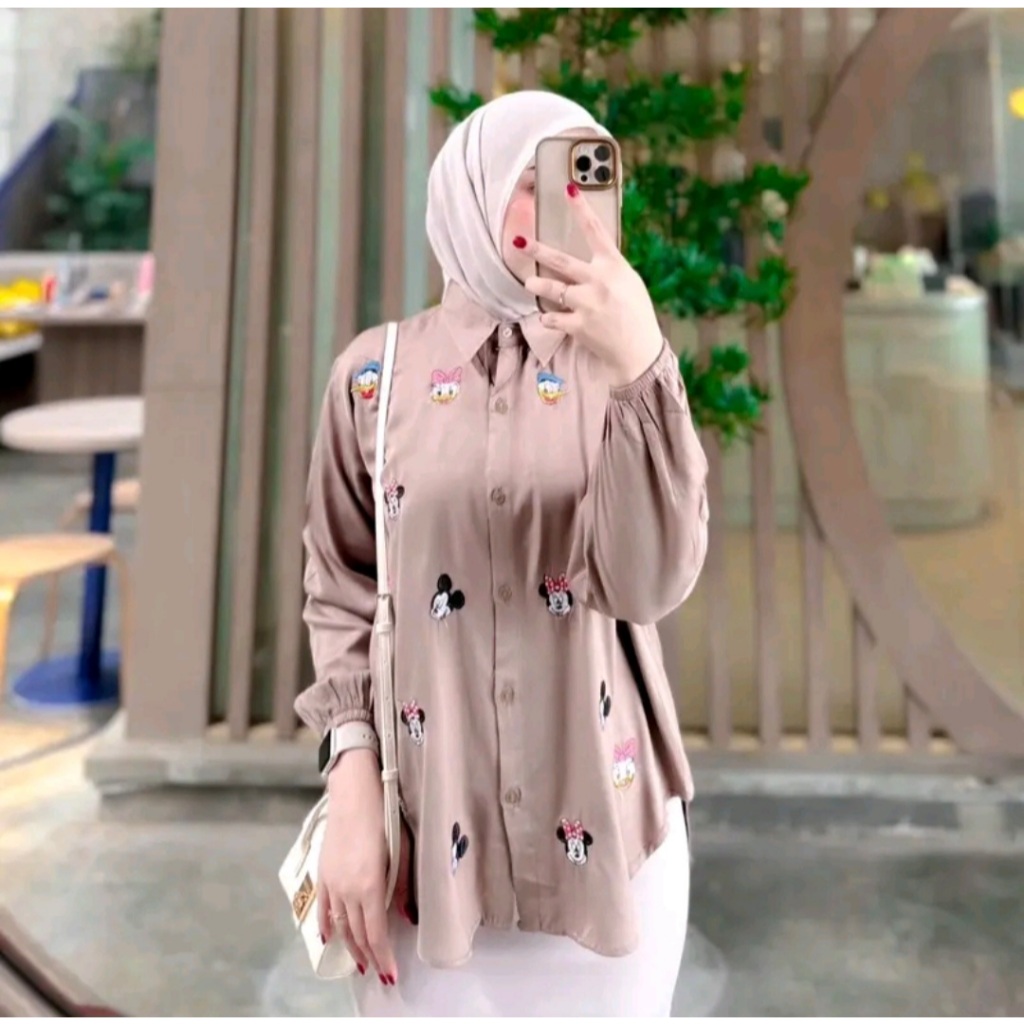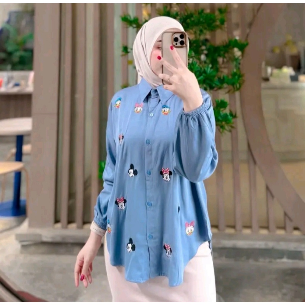 KEMEJA MICKEY ATASAN WANITA BORDIR LUCU RAYON TWILL KEMEJA KEKINIAN BORDIL LUCU