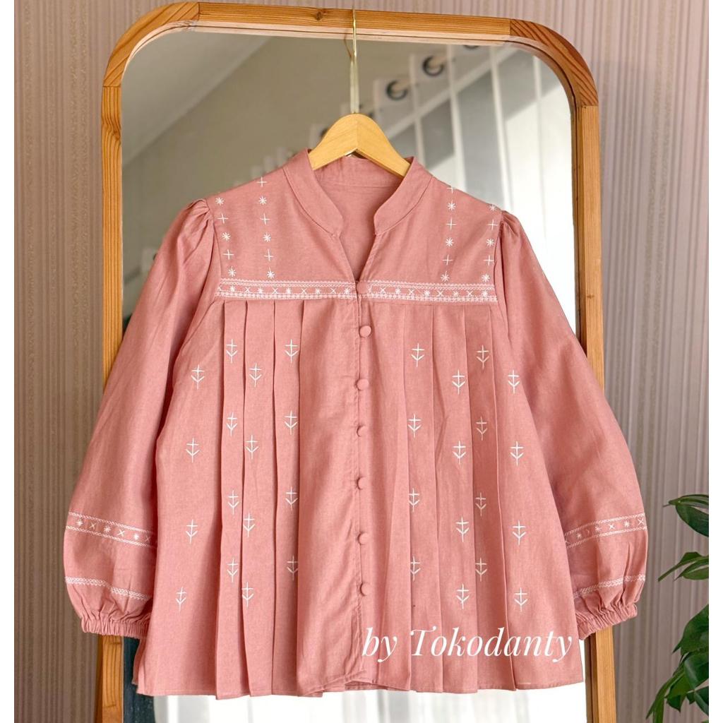 Tifana Blouse Linen Rami Atasan Kemeja Adem Bordir