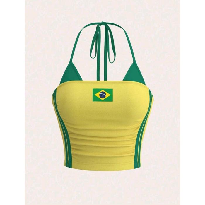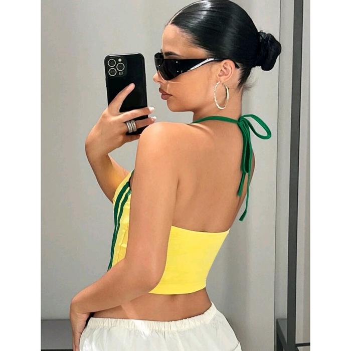 SHEIN ICON WOMEN'S Y2K SPORT HALTER TIE BACKLESS FASHION STRIPED CONTRAST COLOR PRINT TANK T0P - YELLOW, XXS