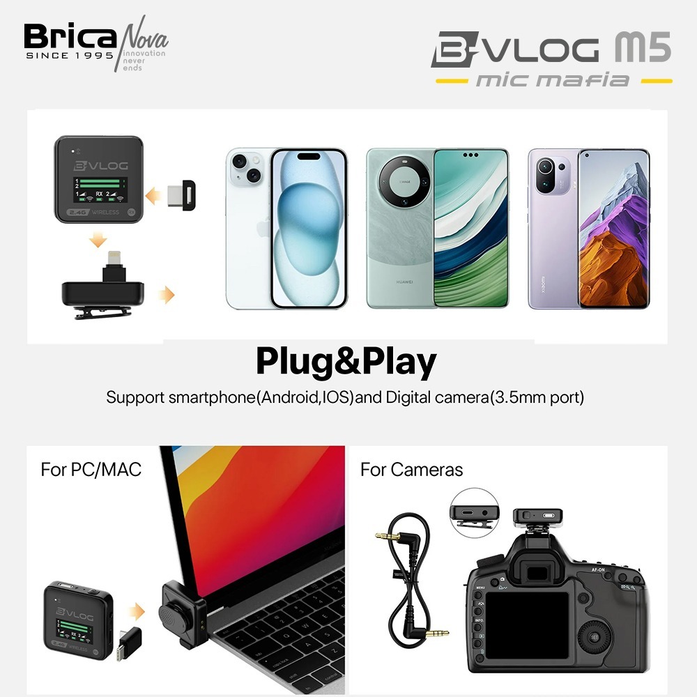 Brica B-VLOG M5 Dual Wireless Microphone - Clip On Mic Vlog - With Charging Case Mic Wireless BVLOG - Bonus T-Shirt