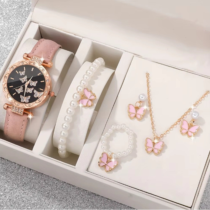 6PCS Mewah Perhiasan Wanita Cincin Kalung Anting Gelang Set Jam Tangan Kupu-kupu Tali Kulit Wanita Kuarsa