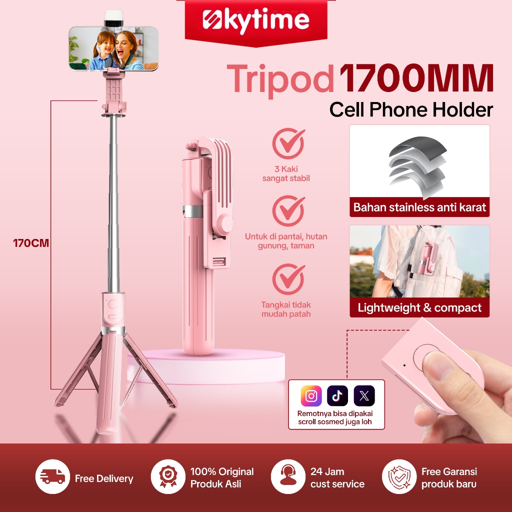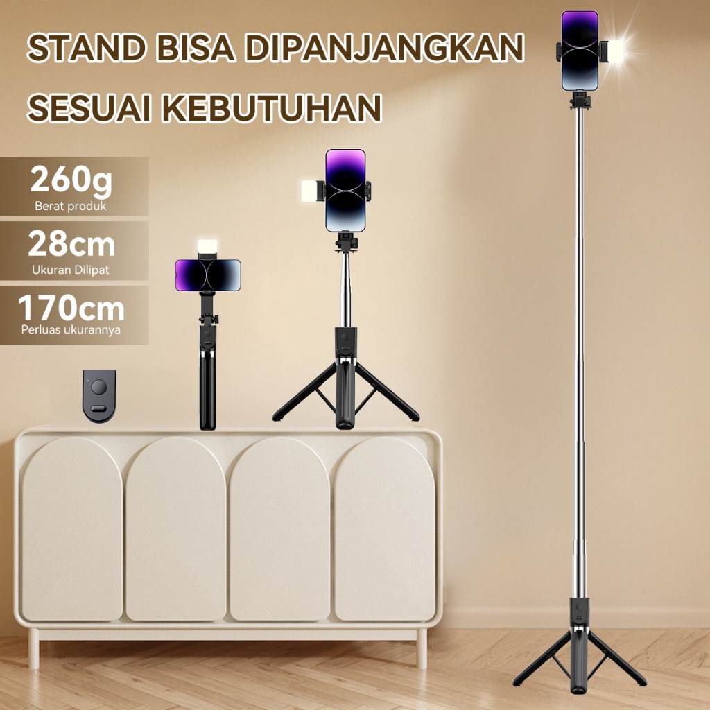 Tongsis 170cm Bluetooth remote LED Lamp BAG Selfie Stick Remote 360° Rotation Adjustable tripod konten kreator