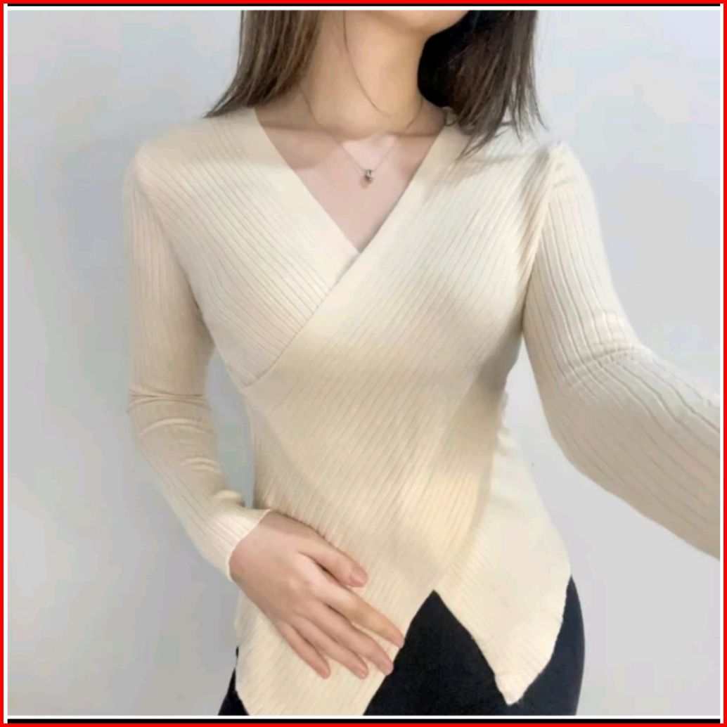 Jiso Knit V-neck Korean Style Wrap Top - Atasan Rajut Wanita Lengan Panjang